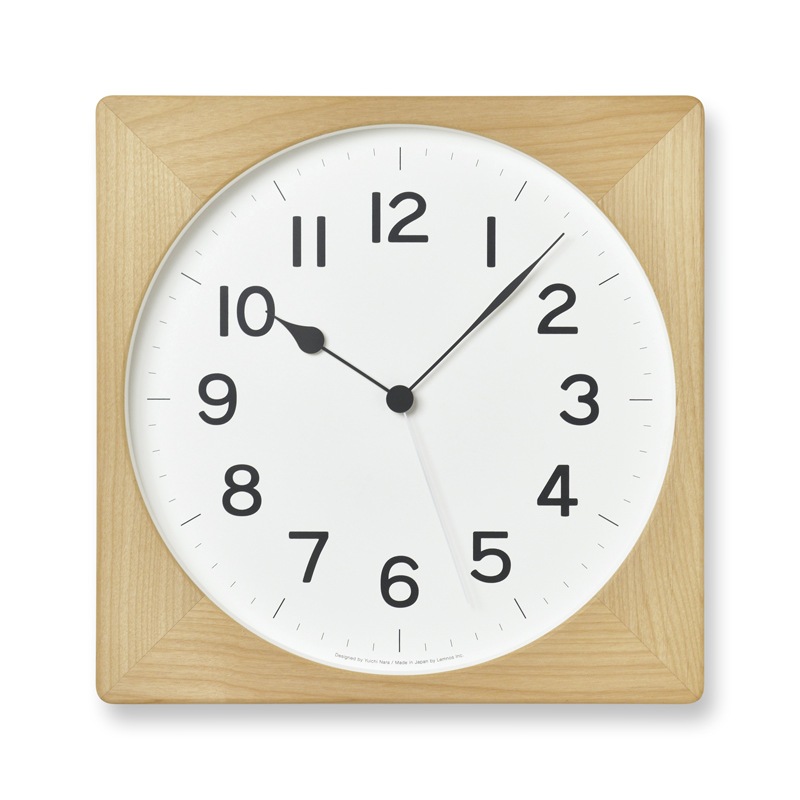 パブリックスペースで使いやすい330mmを基本サイズとして、フォントには昔の国鉄で見やすさを重視して使用されていた「すみ丸角ゴシック体」を、針には時計の歴史上古くから繰り返し使われてきた「スペード針」を踏襲し、時間と分の区別が一目で認識できるように丁寧に文字盤をデザインしています。時計枠体は多様化するインテリア空間との調和を考え、形状で異なる2樹種を選択しています。丸型はブナ材を用いて極限まで細くして時計盤面を大きく見せる工夫を。そして角型はアルダー材の心地よい見えがかりを検証して、それぞれの形によって木目の表情を最大限に活かす意匠となっています。国内の時計枠を専門に製造する木工場の高い加工技術により、大ぶりながらも軽やかさを意図した繊細で優しい形状を実現しました。