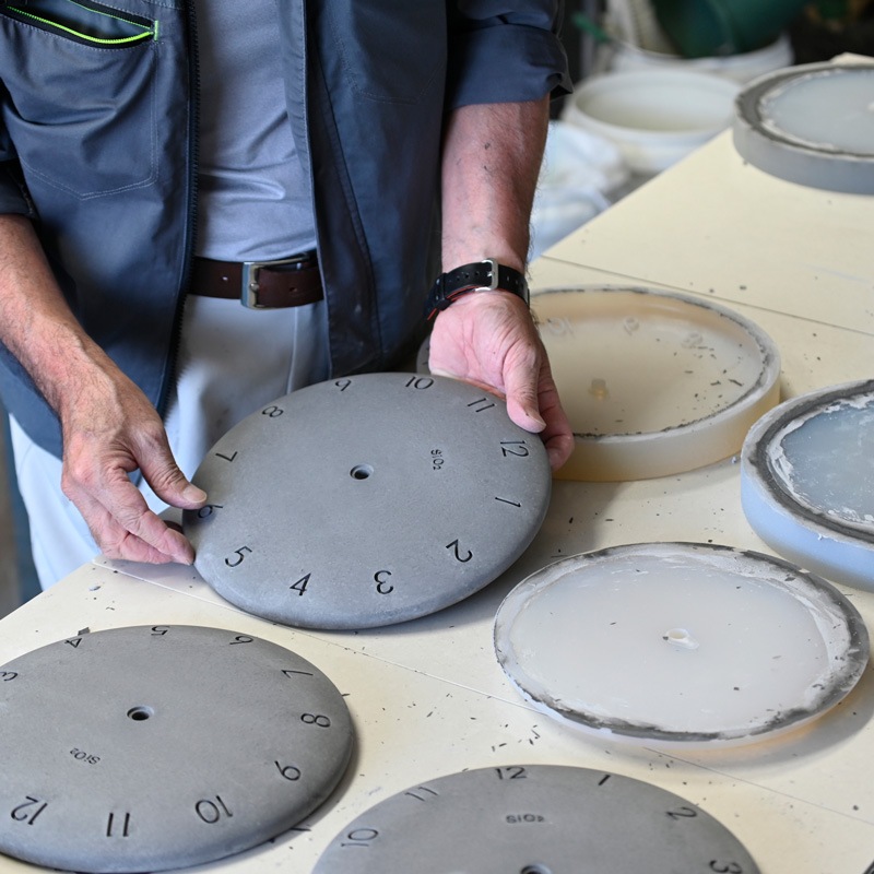 緩やかにカーブする時計の形状は表面に光と影のグラデーションを作り、無数の石の表情を強調します。彫り込まれた時計の数字のエッジを崩すことなく、石の表面を綺麗に洗い出すのはコツがいる作業で、soilの職人の繊細な手作業によって実現することができました。